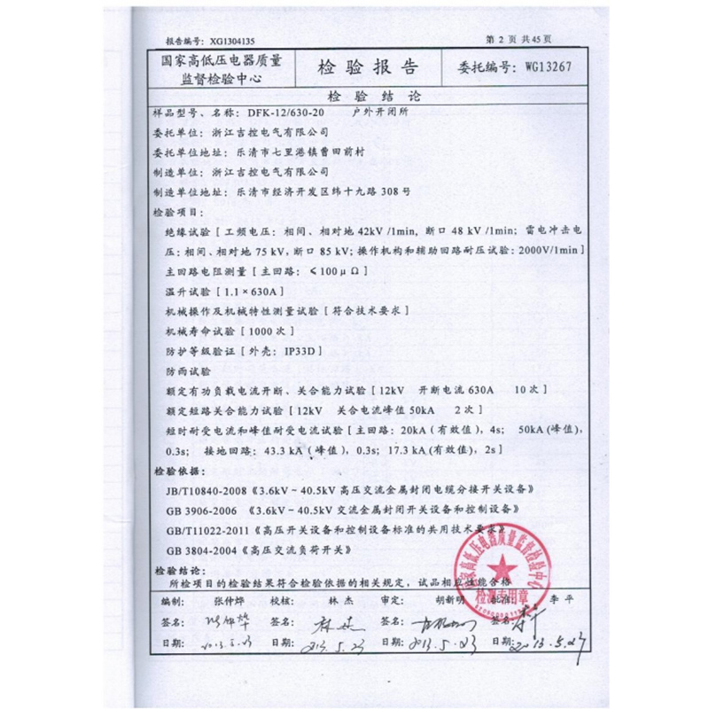 戶內(nèi)交流箱型固定式金屬封閉開關設備檢驗報告